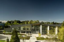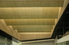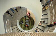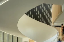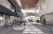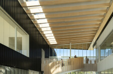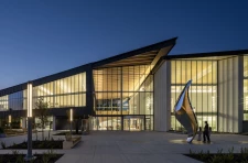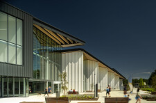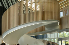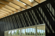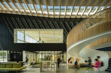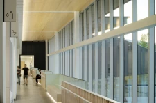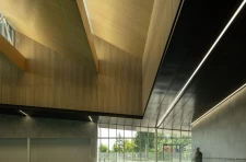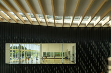 The facility’s double-height lobby serves as a central gathering point. Highlighted by a heavy timber glulam roof, a skylight, and a sculptural steel spiral staircase, the space connects the east and west wings. Acoustic wall panels and expansive glass openings integrate the lobby with adjacent program areas, reinforcing the building’s open and inclusive atmosphere.