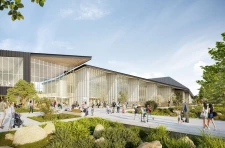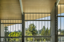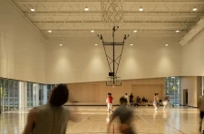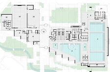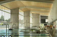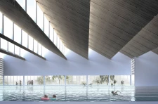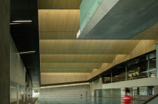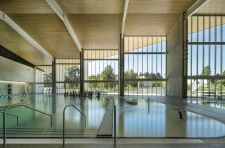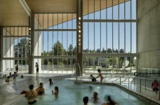 The east wing features aquatic spaces catering to wellness and competitive needs. A multi-use leisure pool combines lap lanes, spray elements, and a lazy river for play and rehabilitation. Adjacent glass bi-folding doors lead to an outdoor sun patio overlooking the ravine. A separate eight-lane, 50-meter lap pool is illuminated by indirect daylight from a sawtooth hybrid roof of steel trusses and mass timber, reducing glare and improving performance conditions for swimmers.